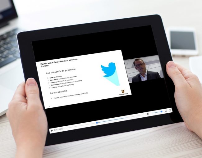 Vidéo d’un formateur associée à une projection power point qui permet de diffuser un contenu assorti d’explications détaillées et techniques.